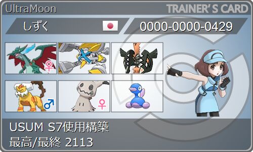 あけましておめでとうございます。 BWの頃からこのブログをやっていますので早いもので約6年になりますが、今年も宜しくお願い致します。今回は、ウルトラサン・ムーンの初記事になります。シーズン7のシングル2100達成時の構築記事です。<使用パーティ> …